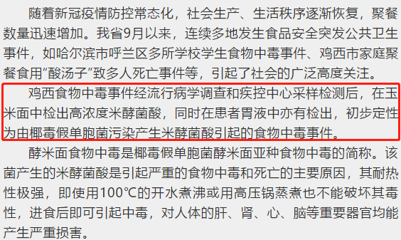 根据黑龙江省卫生健康委员会12日发布的最新信息,鸡西食物中毒事件经流行病学调查和疾控中心采样检测后,在玉米面中检出高浓度米酵菌酸,同时在患者胃液中亦有检出,初步定性为由椰毒假单胞菌污染产生米酵菌酸引起的食物中毒事件。否定了此前酸汤子致使多人中毒的疑似物质黄曲霉素。